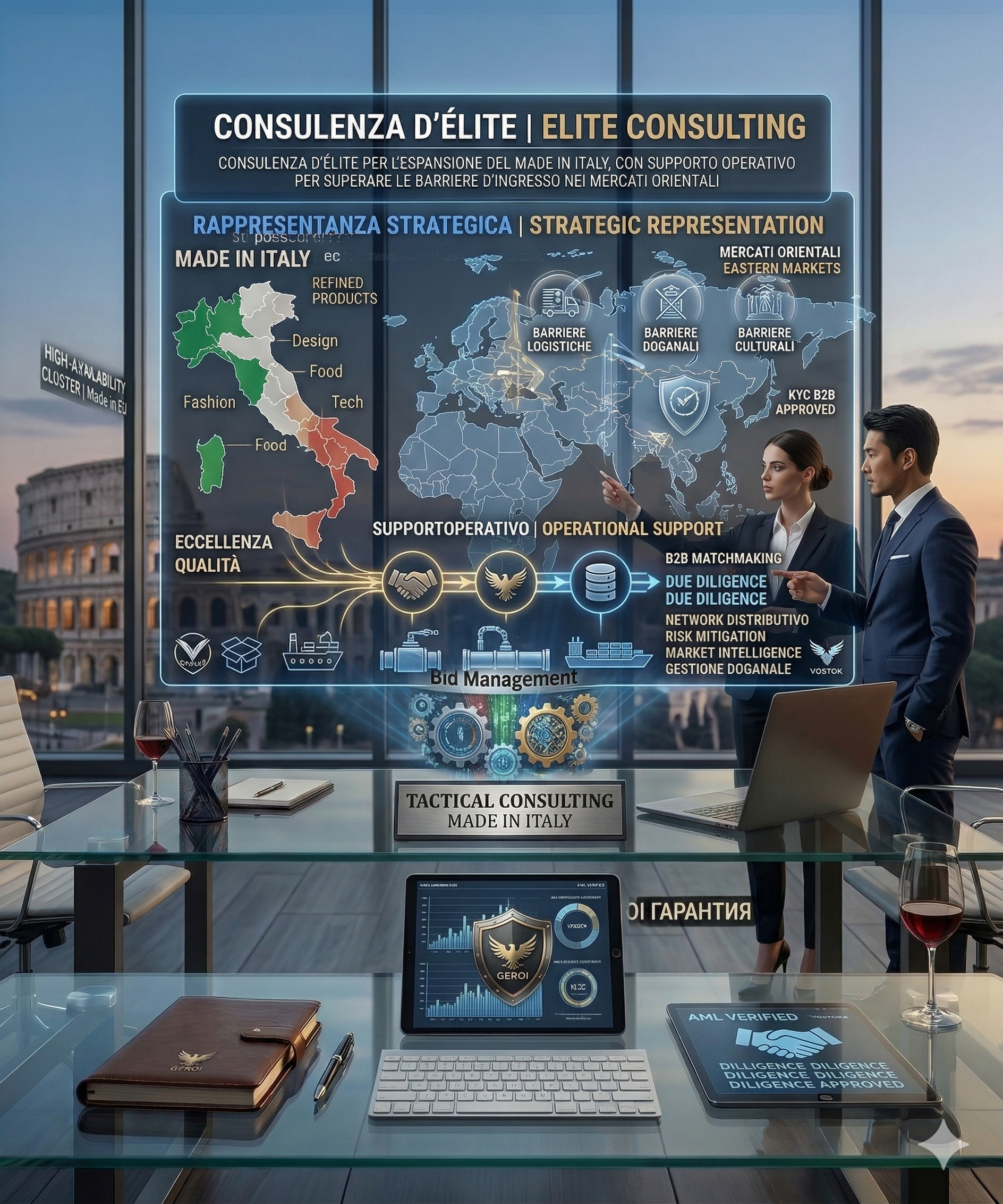 Consulenza d'élite per l'espansione del Made in Italy, con supporto operativo per superare le barriere d'ingresso nei mercati orientali.