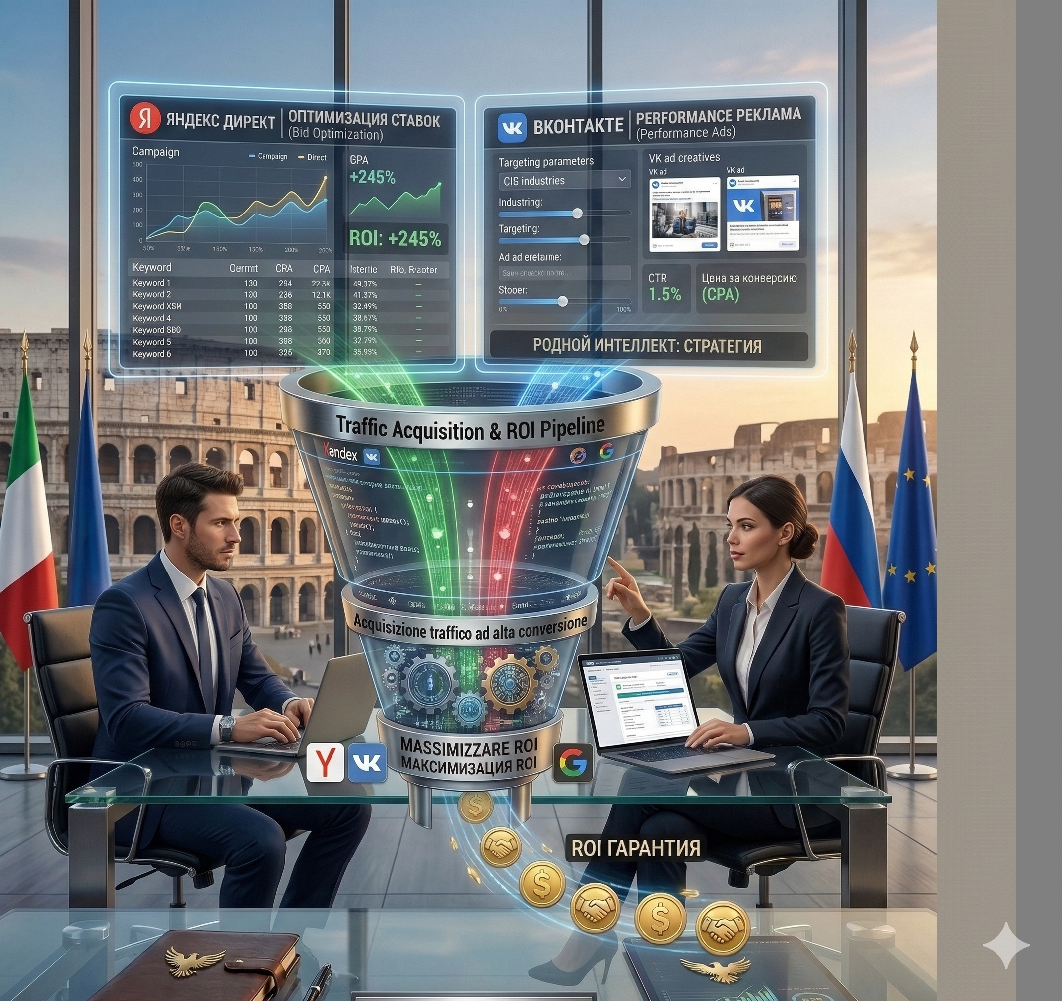 Acquisizione traffico ad alta conversione su Yandex Direct e VKontakte, gestita da specialisti madrelingua per massimizzare il ROI.